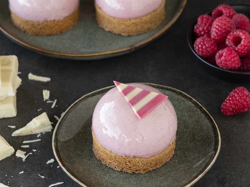 Een koekbodem gevuld met spijs met bovenop een framboosbavaroise gevuld met stukjes witte chocolade. Gedoopt in rose dipi en bovenop een chocolaatje.
