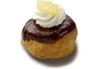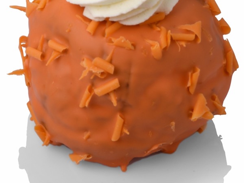 Soezen gevuld met slagroom, gedoopt in chocoladefondant en gedecoreerd met slagroom. LET OP! in de dagen voor Koningsdag wordt dit gebakje geleverd als Oranje soes