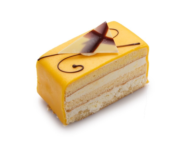 Dit heerlijke gebakje is gevuld met slagroom, bedekt met een laagje marsepein, en wordt gedecoreerd met een chocolaatje