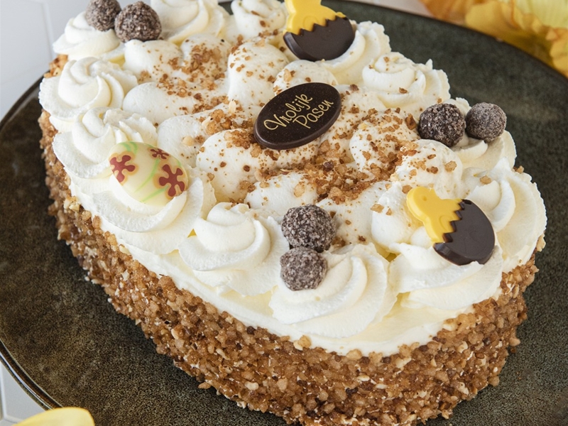 2 plakken hazelnootschuim in ei model gevuld met slagroom en opgespoten met slagroom, aangezet met hazelnootkrokant en gedecoreerd met paasdecoratie. Voor ca. 6 - 8 personen