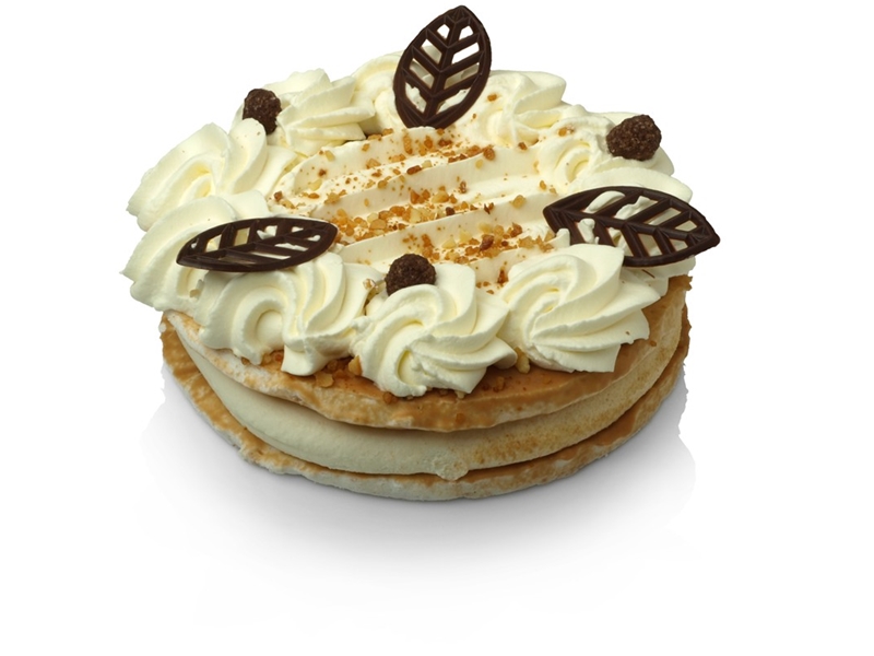 Rond taartje voor ca. 6 personen van plakken hazelnootschuim, gevuld met slagroom en afgewerkt met een laagje van stukjes hazelnoot. De gebruikte garnering kan verschillen met de getooonde foto’s op de website.
